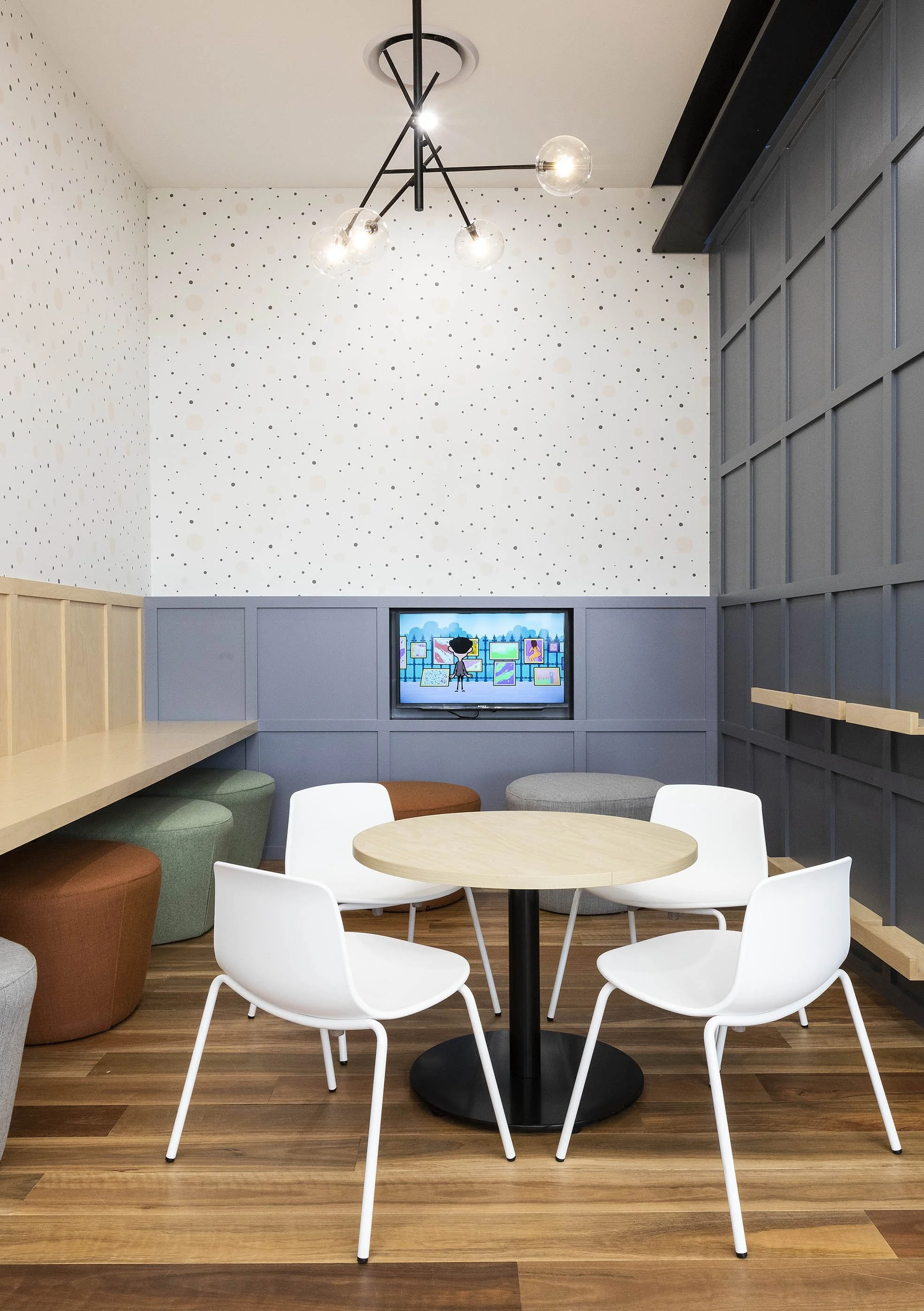 This flexibility supports group discussions, workshops, and presentations within the same space. Examples of education and commercial environments can be explored in the portfolio.